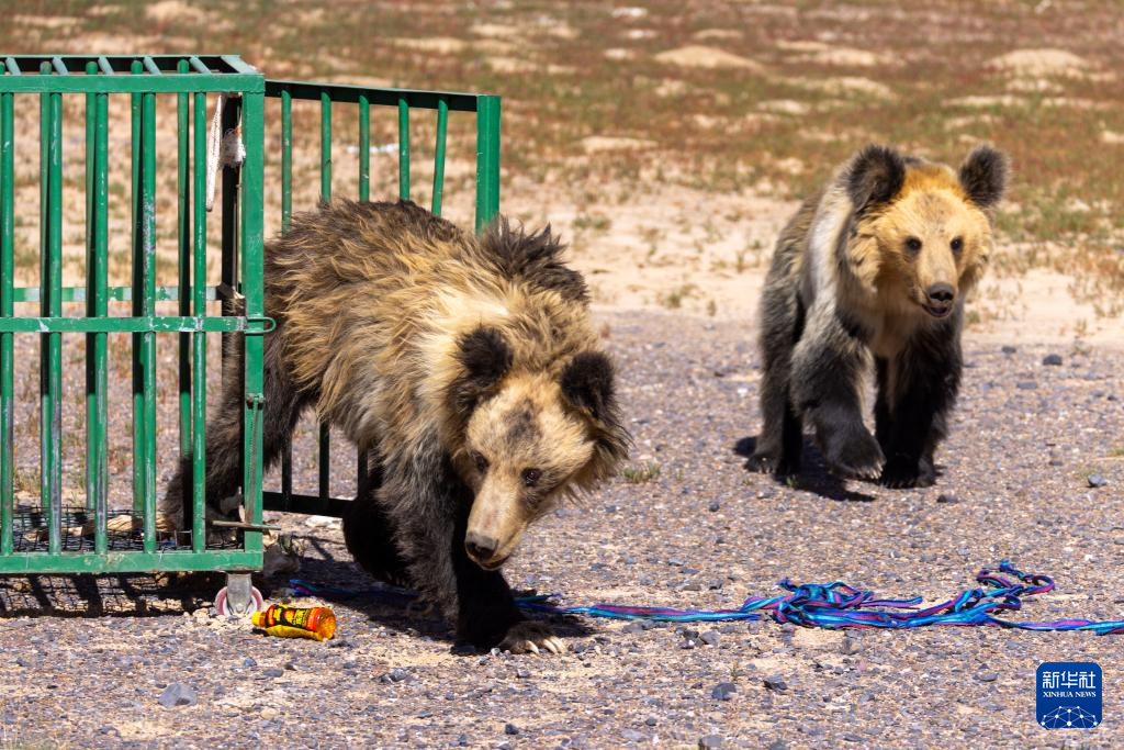 在西藏那曲市尼瑪縣的羌塘國家級自然保護區(qū)核心區(qū),被放歸的棕熊母子走出籠子(8月30日攝)。新華社記者 姜帆 攝