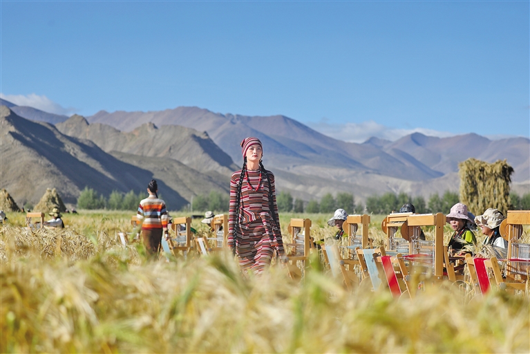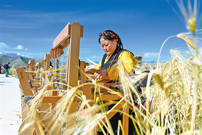 萬里晴空下,金色青稞隨風(fēng)搖曳,靜等豐收的季節(jié);希望的田地上,在傳承和創(chuàng)新中,千年氆氌再現(xiàn)輝煌。