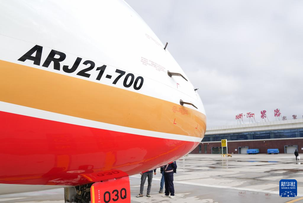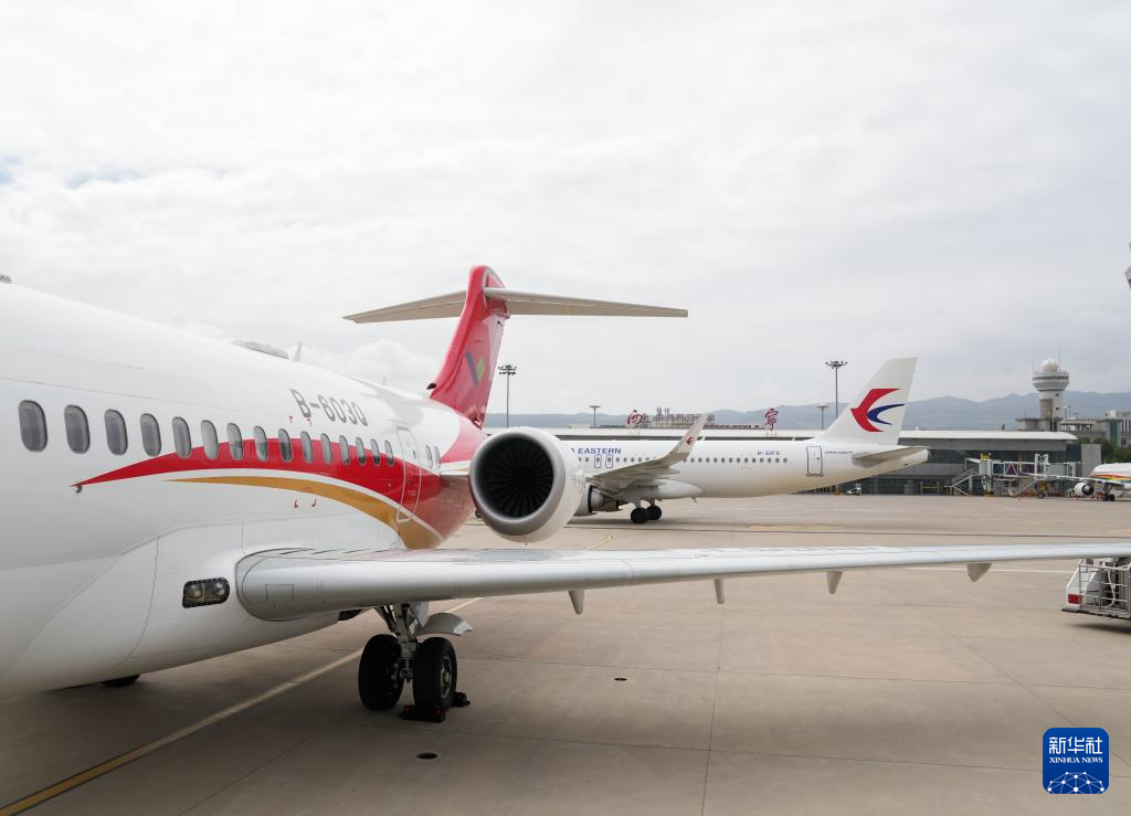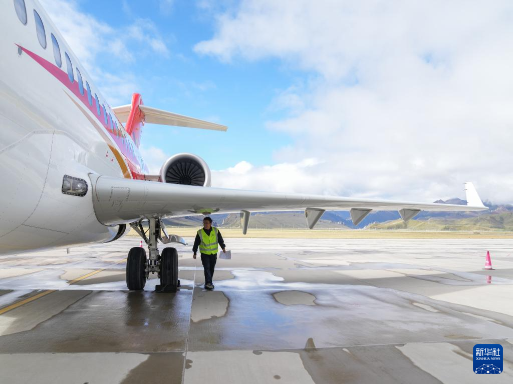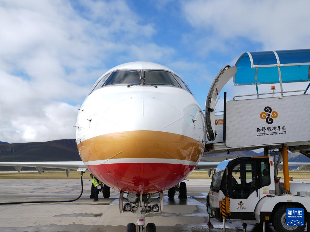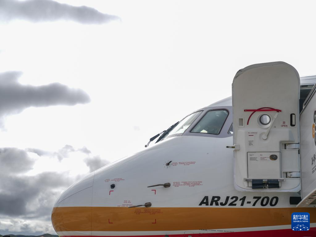 9月21日,國產(chǎn)商用飛機(jī)ARJ21飛抵青海果洛瑪沁機(jī)場。新華社記者 丁汀 攝
