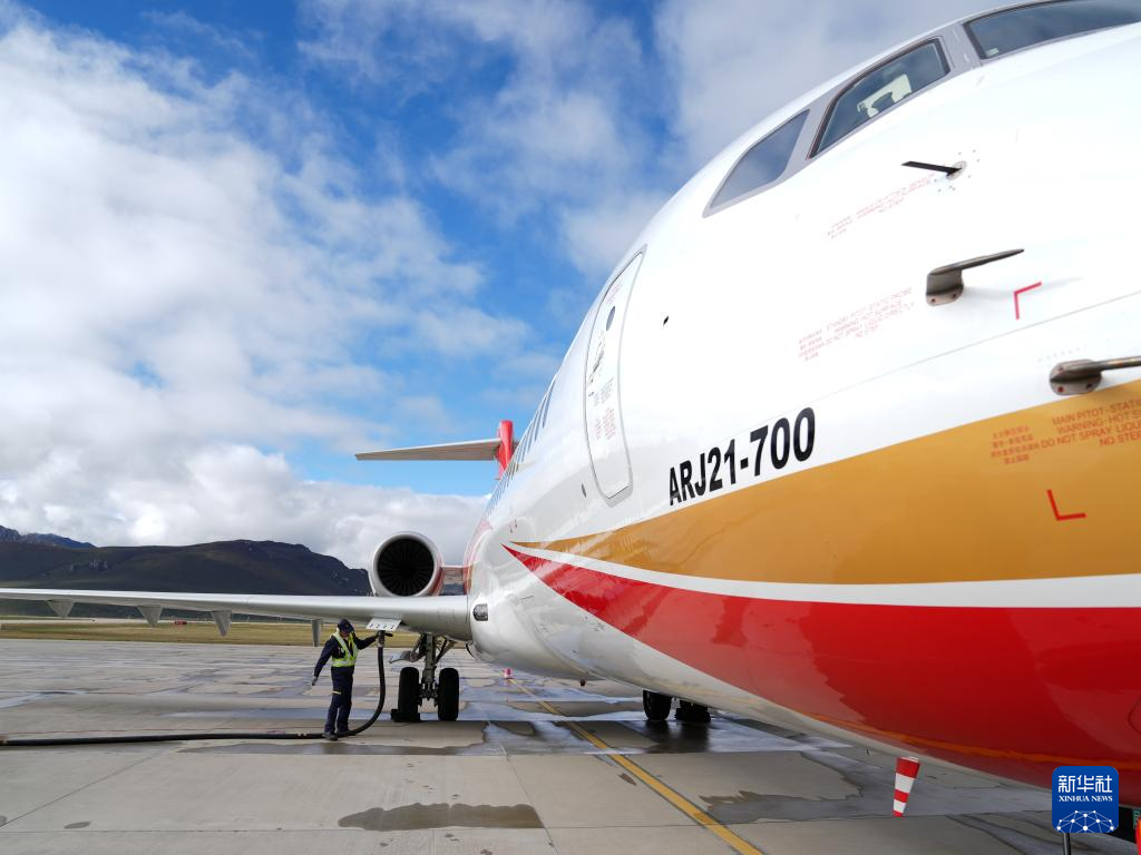 9月21日,在青海果洛瑪沁機(jī)場,工作人員在為國產(chǎn)商用飛機(jī)ARJ21加油。新華社記者 丁汀 攝