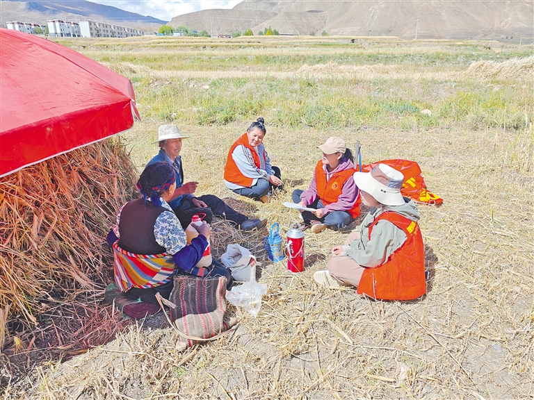 圖為民族團(tuán)結(jié)進(jìn)步宣傳活動(dòng)月期間,薩迦縣志愿者在田間向群眾宣講民族團(tuán)結(jié)相關(guān)知識(shí)。