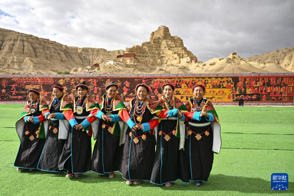 在西藏阿里地區(qū)札達(dá)縣古格王國遺址腳下,當(dāng)?shù)卮迕癖硌荨靶琛焙蠡ハ嘟涣鳎?月11日攝)。新華社記者 孫瑞博 攝