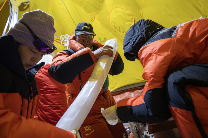 在普若崗日冰原,徐柏青(中)在封裝鉆取的冰芯。新華社記者姜帆 攝
