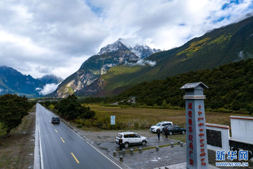 10月11日拍攝的波密通車紀(jì)念廣場(無人機(jī)照片)。2020年,西藏波密縣通過查閱文獻(xiàn)史料、比對老照片、咨詢當(dāng)?shù)乩先?、遠(yuǎn)程連線老一輩同志等方式,考證出當(dāng)時舉行通車典禮的地點(diǎn)為今波密縣松宗鎮(zhèn)角達(dá)村國道318旁。為紀(jì)念這一歷史事件,2021年4月波密縣在此處修建了波密通車紀(jì)念廣場。新華網(wǎng) 旦增努布 攝