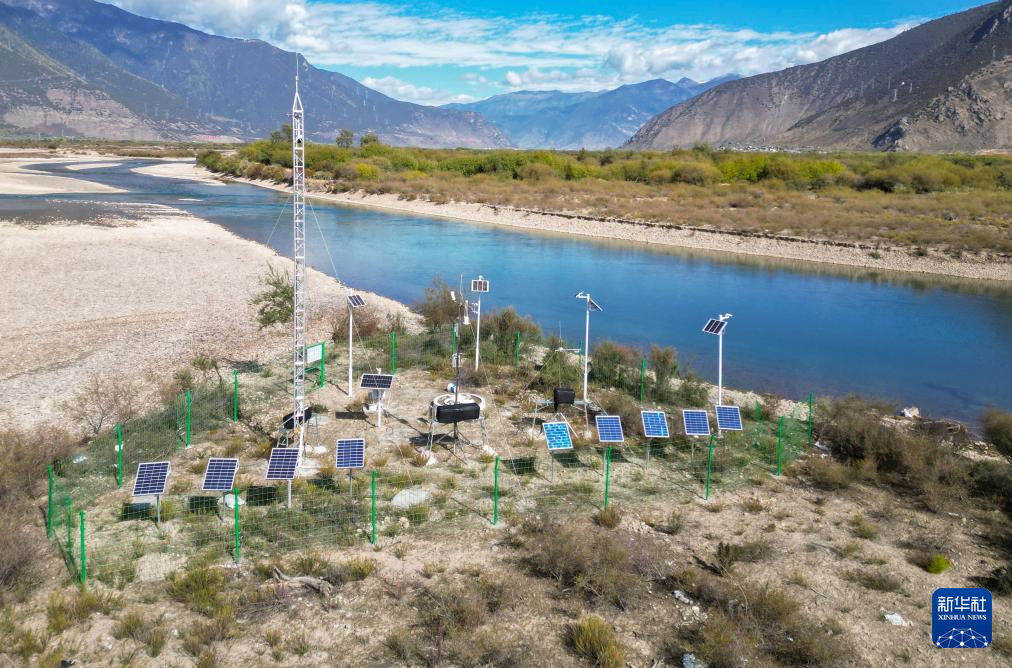 這是在林芝雅尼國(guó)家濕地公園尼洋河畔拍攝的生態(tài)監(jiān)測(cè)系統(tǒng)(10月24日攝,無(wú)人機(jī)照片)。新華社記者 劉天宇 攝