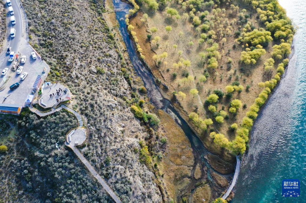 西藏林芝雅尼國(guó)家濕地公園內(nèi)的觀景臺(tái)和步行棧道(10月24日攝,無(wú)人機(jī)照片)。新華社記者 李賀 攝