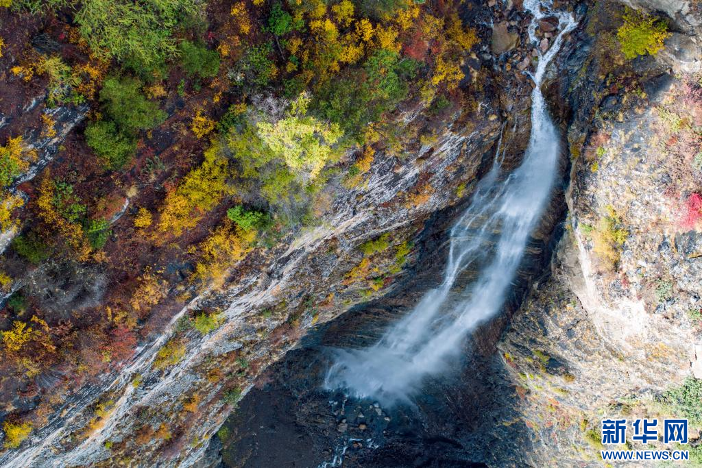 10月11日,在西藏林芝市波密縣境內川藏公路沿途拍攝的瀑布(無人機照片)。新華網 旦增努布 攝