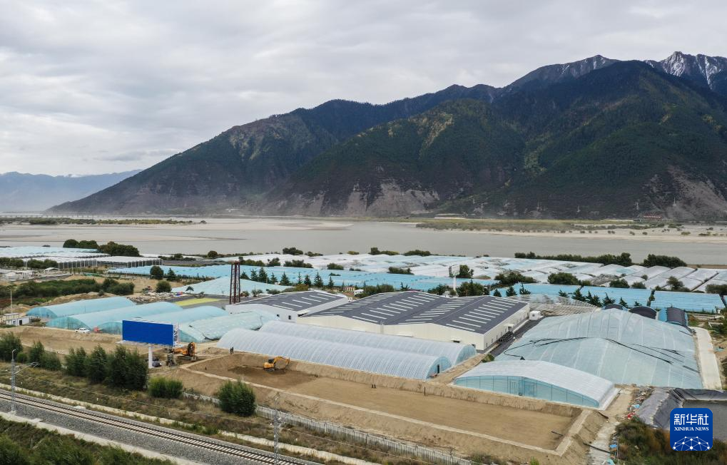 在西藏林芝市米林農(nóng)場(chǎng)內(nèi)的粵林高原漁業(yè)科技園,依托當(dāng)?shù)赜欣h(huán)境而興建的養(yǎng)殖育種基地初顯規(guī)模(無人機(jī)照片,10月24日攝)。新華社記者 李賀 攝