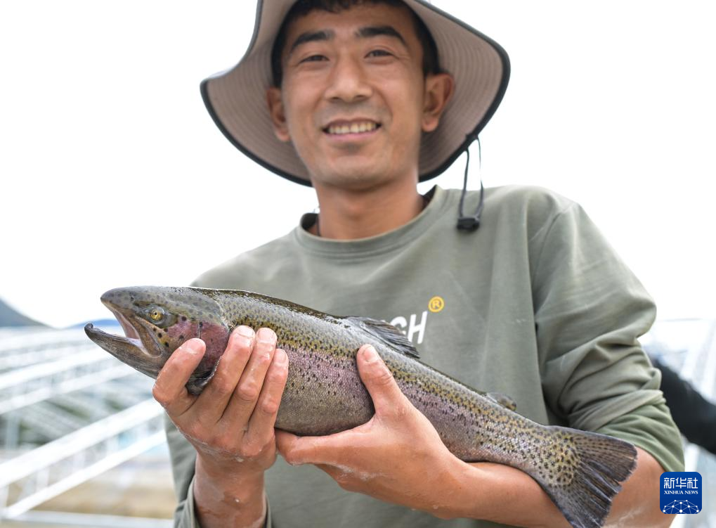 在西藏林芝市米林農(nóng)場(chǎng)的粵林高原漁業(yè)科技園工作的藏族小伙尼瑪旺堆在展示本地飼養(yǎng)的虹鱒魚(10月24日攝)。新華社記者 李賀 攝