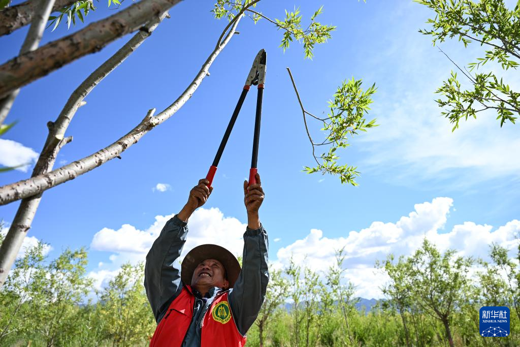 在雅江北岸南木林生態(tài)示范區(qū),當?shù)刈o林員在修剪林木(2024年9月1日攝)。新華社記者 孫瑞博 攝