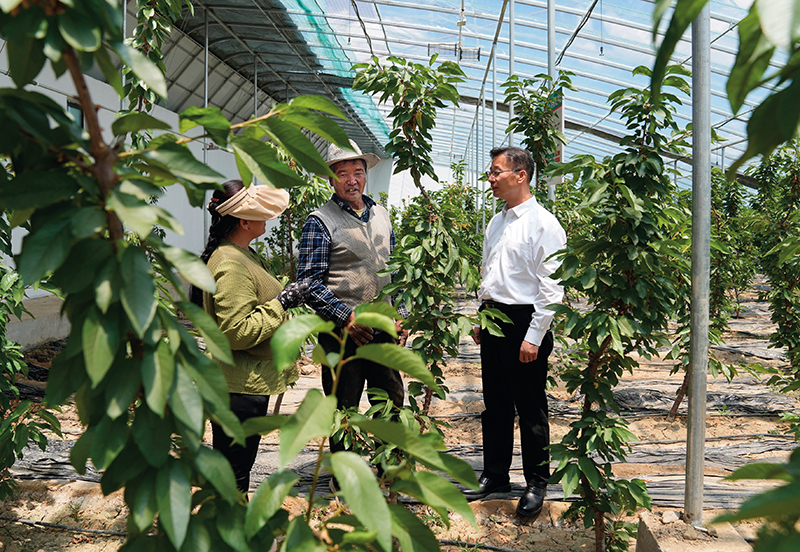 在西藏日喀則市白朗縣,李東(右一)在與當?shù)胤N植戶交流(2024年6月21日攝) 丁汀攝