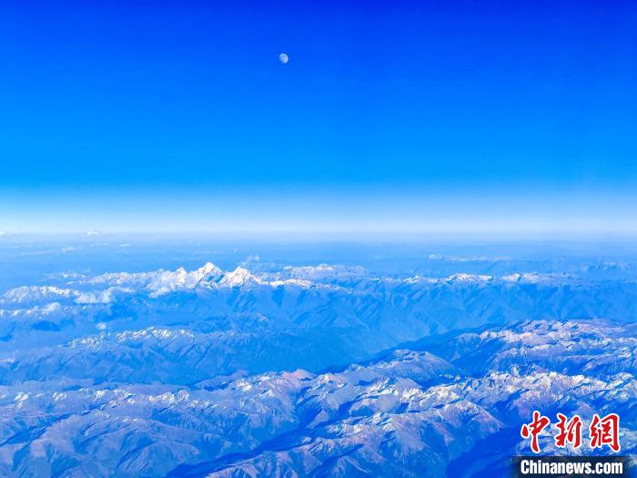 近日,中新網(wǎng)記者從云南昆明長(zhǎng)水國際機(jī)場(chǎng)乘機(jī)前往西藏自治區(qū)拉薩市,飛機(jī)穿過橫斷山脈,抵達(dá)雪域高原。望向窗外,沿途依次看到了玉龍雪山、南迦巴瓦雪山以及遠(yuǎn)遠(yuǎn)的念青唐古拉雪山等,還有很多小新也不知道名字的雪山,可謂實(shí)現(xiàn)了“雪山自由”。圖為11月13日,從飛機(jī)上拍到的月亮與玉龍雪山(右下方)。記者 江飛波 攝