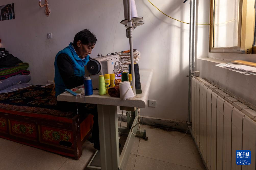 措勤縣扎日南木錯(cuò)社區(qū)居民林瓊在自家的暖氣房?jī)?nèi)制作傳統(tǒng)民族帽飾(11月20日攝)。新華社記者 姜帆 攝