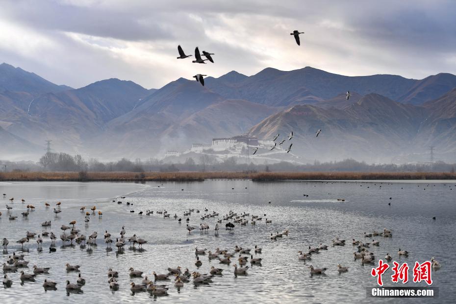 12月29日,冬日早晨,拉薩美如畫。拉薩河被晨光染成金色,河水靜靜流淌。西藏自治區(qū)拉薩市的拉魯濕地國(guó)家級(jí)自然保護(hù)區(qū)內(nèi),候鳥歡快,忙著覓食、嬉戲。遠(yuǎn)處,布達(dá)拉宮與拉魯濕地相互映襯,構(gòu)成了一幅絕美畫卷。圖為12月29日,在拉魯濕地越冬的候鳥成群結(jié)隊(duì)。貢確 攝