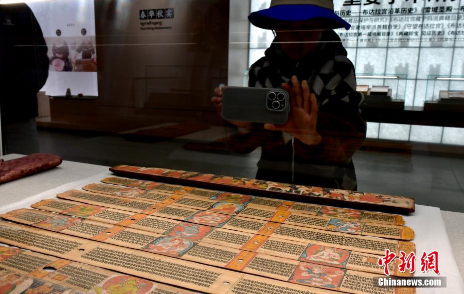 以“見證與守望——鑄牢中華民族共同體意識(shí)主題展”為主題的展覽近日亮相西藏自治區(qū)拉薩市布達(dá)拉宮雪城珍寶館。本次主題展精選100余件文物珍品,展覽通過文物、古籍及布達(dá)拉宮的傳承與發(fā)展,講述各民族交往交流交融的故事。圖為1月2日,觀眾拍攝展覽中的13世紀(jì)《般若八千頌》貝葉經(jīng)寫本。中新社記者 李林 攝