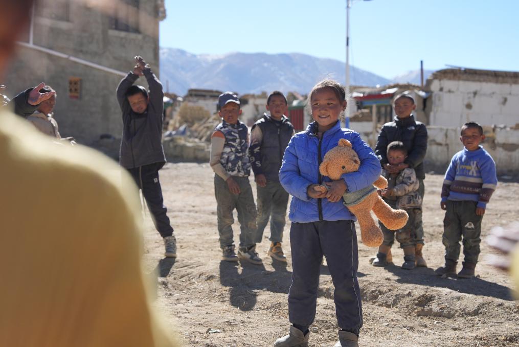 1月8日,在日喀則市定日縣措果鄉(xiāng)塘仁村地震災(zāi)后安置點,西藏星光社會工作服務(wù)中心社工向孩子們贈送玩偶熊,并給他們表演節(jié)目。