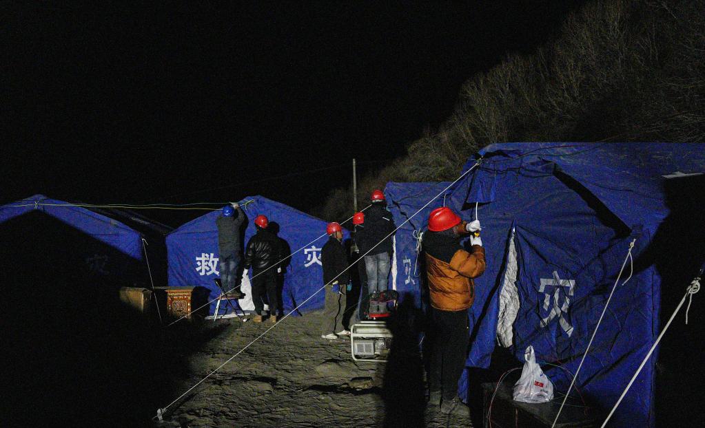 1月7日,在定日縣長所鄉(xiāng)集中安置點,工作人員在保障電力供應(yīng)。