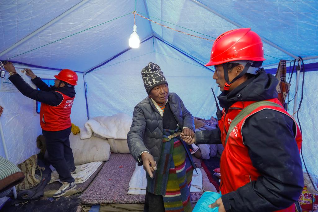塘仁村63歲村民桑杰卓瑪家的三間帳篷搭建在自家震損房屋旁邊的草地里,國(guó)家電網(wǎng)搶險(xiǎn)救援人員為她從市電主線接通入戶(hù)?!斑@下能檢查的項(xiàng)目更全了?!爆F(xiàn)場(chǎng)攜帶電子儀器、準(zhǔn)備為桑杰卓瑪一家進(jìn)行入戶(hù)體檢的醫(yī)療保障人員說(shuō)。