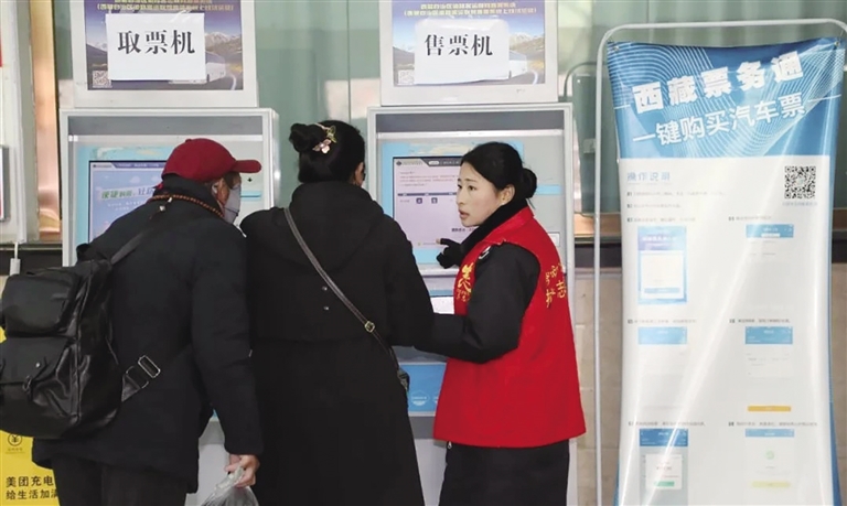 志愿者幫助旅客自助購票。圖由西藏自治區(qū)交通運輸廳提供