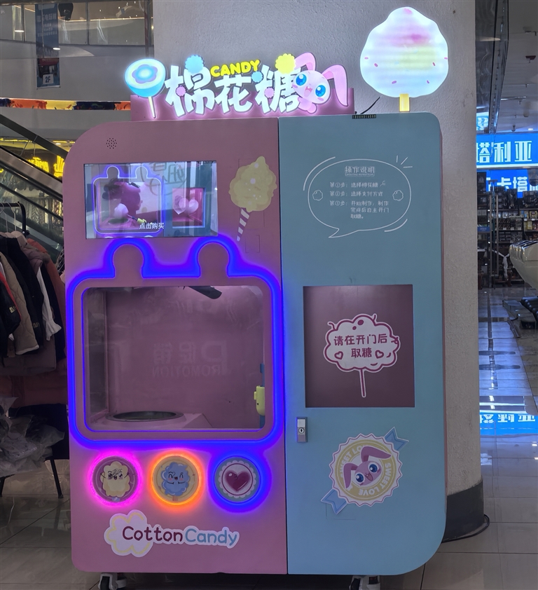除了自助游戲機(jī),自助棉花糖機(jī)也是一大亮點。在拉薩市多家大型商超內(nèi),自助棉花糖機(jī)成為了孩子們的新寵。記者走訪發(fā)現(xiàn),目前拉薩各大商場內(nèi)的棉花糖機(jī)大多為同一品牌,機(jī)子中的棉花糖有42種,一個棉花糖售價19.9元。市民可以根據(jù)口味、顏色、造型選擇棉花糖,操作流程也十分便捷,選購后掃碼支付即可。