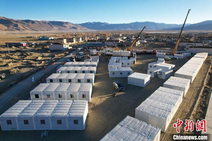 圖為1月10日,西藏定日縣長(zhǎng)所鄉(xiāng)森嘎村正搭建移動(dòng)板房。(無(wú)人機(jī)畫(huà)面)江飛波 攝