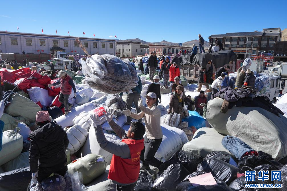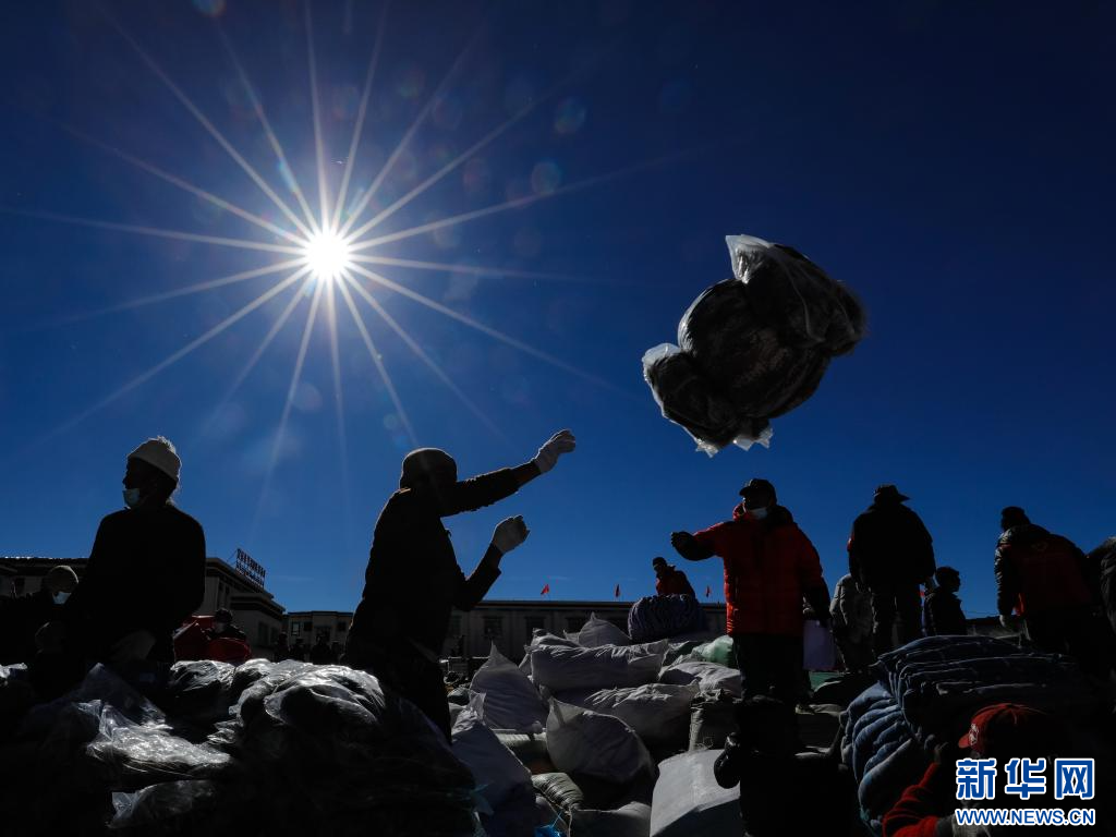 1月10日,在定日縣民族團(tuán)結(jié)廣場,人們搬運(yùn)將要運(yùn)往受災(zāi)群眾安置點(diǎn)的過冬物資。新華社記者 沈伯韓 攝