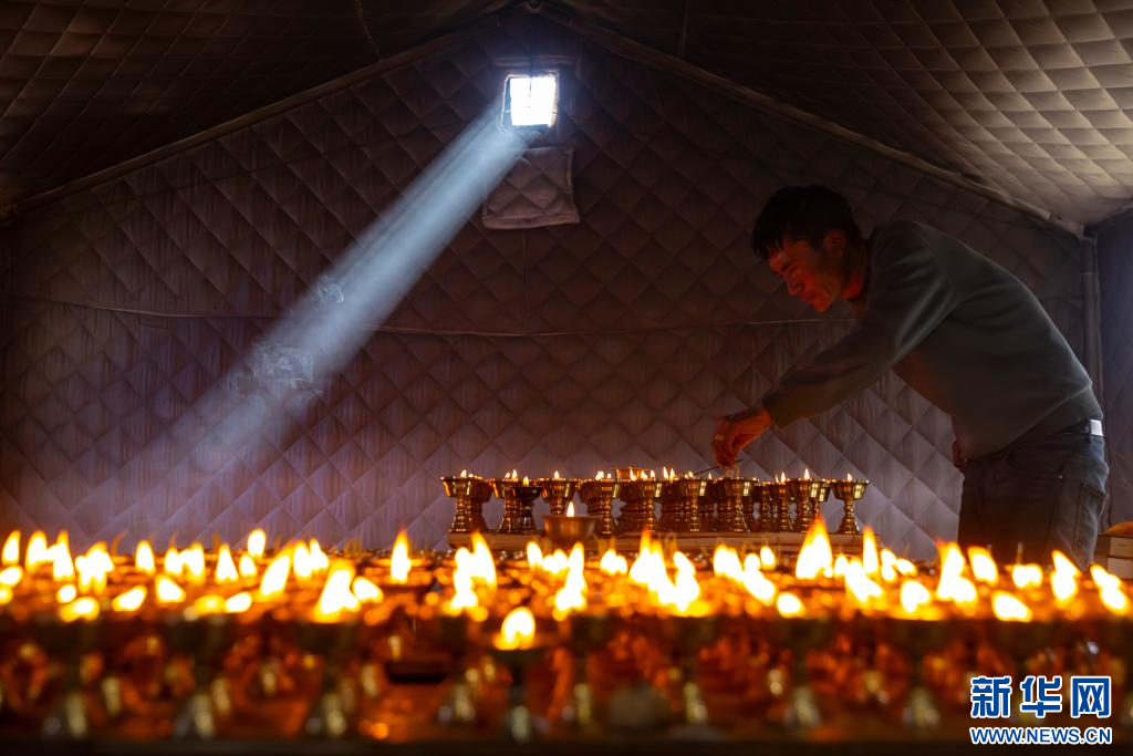 1月12日,在定日縣長所鄉(xiāng)古榮村,一名受災(zāi)村民為在定日縣6.8級地震中逝世的親人點(diǎn)長明燈祈福。新華社記者 沈伯韓 攝