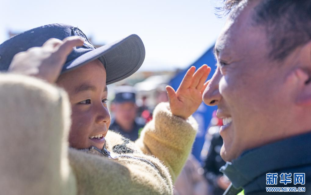 在定日縣長所鄉(xiāng)嘎布村,一個(gè)孩子戴上移民警察米瑪次仁的帽子敬禮(1月14日攝)。 新華社記者 丁增尼達(dá) 攝