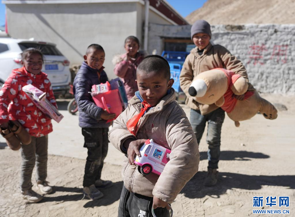 1月11日,災(zāi)區(qū)的孩子們領(lǐng)到了愛心人士捐贈(zèng)的玩具。新華社記者 晉美多吉 攝