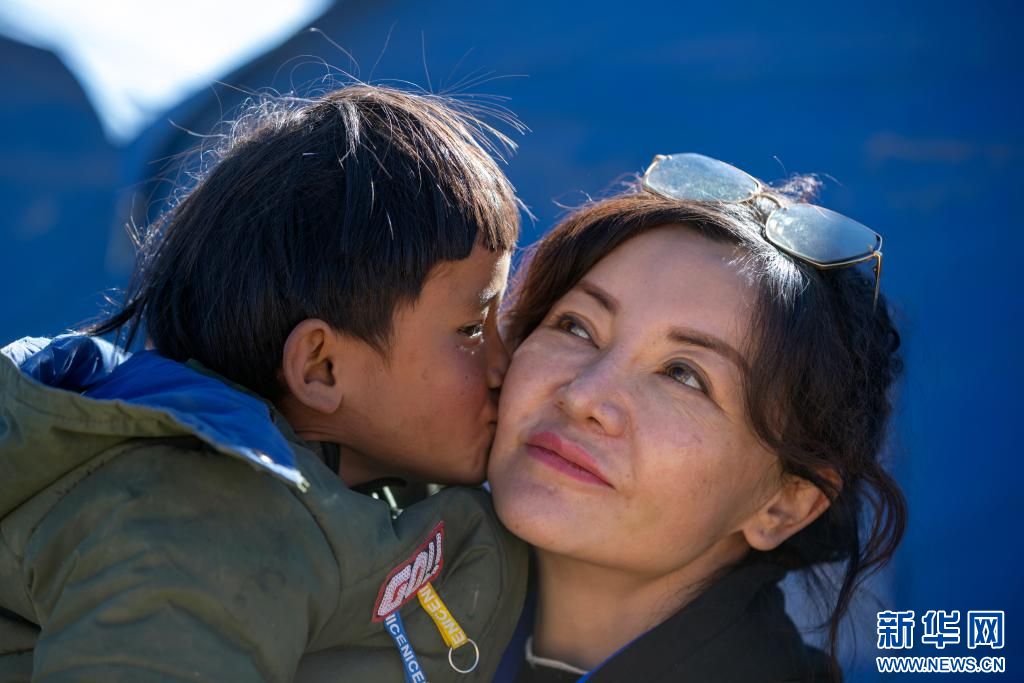 1月11日,在定日縣曲洛鄉(xiāng)措昂村的受災(zāi)群眾安置點(diǎn),一名藏族女孩親吻中國科學(xué)院心理研究所應(yīng)急心理救援隊(duì)的專家譚惜仁(右)。新華社記者 沈伯韓 攝