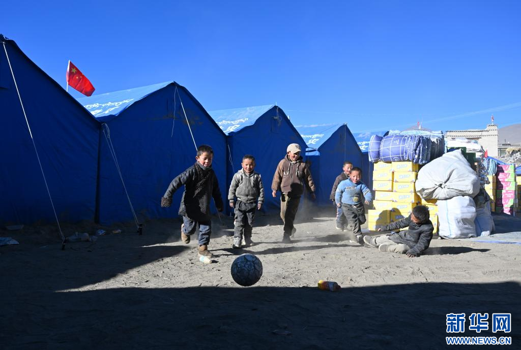 1月11日,薩迦縣麻布加鄉(xiāng)普村安置點(diǎn)的小朋友在踢球。新華社記者 李響 攝