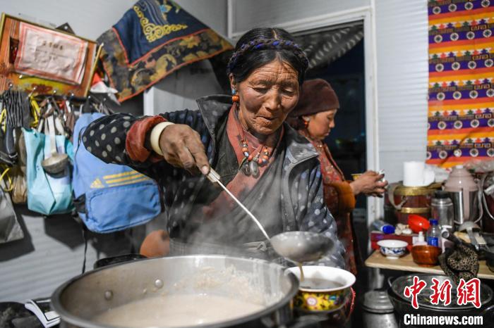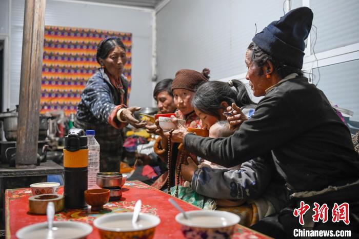 “今年我們家的‘古突’(一種藏式面食)里有面疙瘩、牛肉、蕨麻、奶渣、米飯,很香、很好吃?!?月28日是農歷春節(jié)除夕,恰逢日喀則農事新年“古突夜”,在西藏定日縣曲洛鄉(xiāng)措昂村安置板房內,20歲的央宗喝完一碗母親煮的“古突”后對中新社記者說。