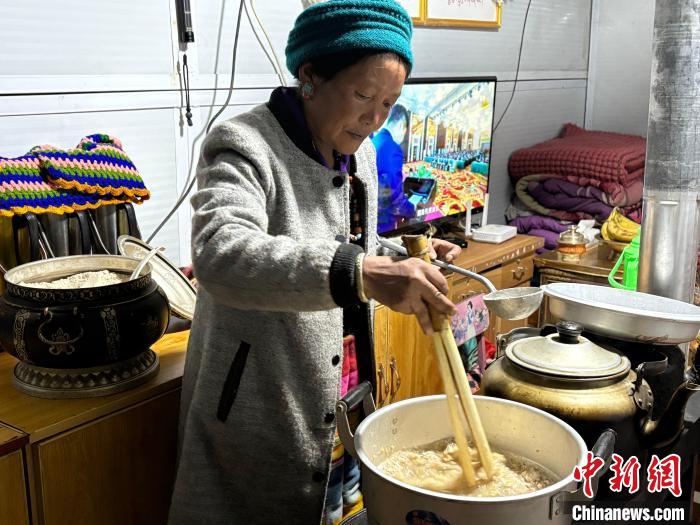 圖為日喀則市拉孜縣錫欽鄉(xiāng)錫欽村安置板房內,村民瓊拉在煮大年初一的“羌鍋”。何金龍 攝