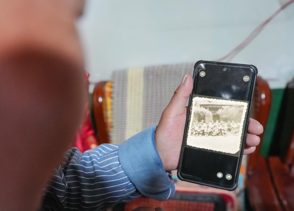 1月29日,孫建學(xué)翻看手機(jī)上留存的年輕時(shí)修路的照片。新華社記者 晉美多吉 攝