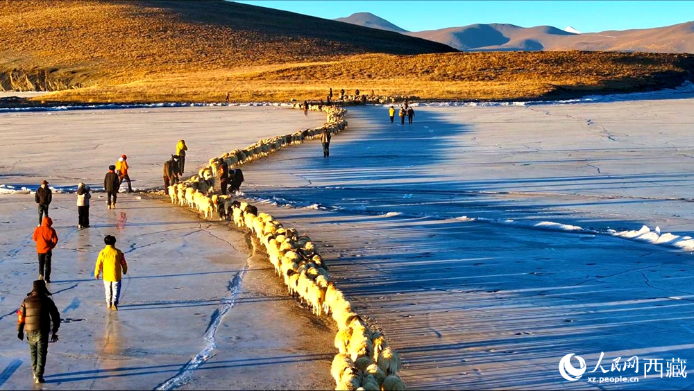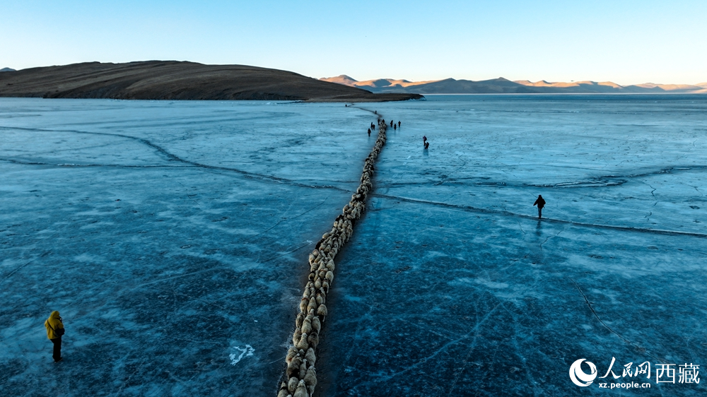 隨著一聲號令,牧民們驅(qū)趕著羊群,踏上冰封的湖面。遠(yuǎn)遠(yuǎn)望去,羊群如同一串串黑白相間的珍珠,在湛藍(lán)的冰面上緩緩移動,構(gòu)成一幅壯美的高原畫卷。