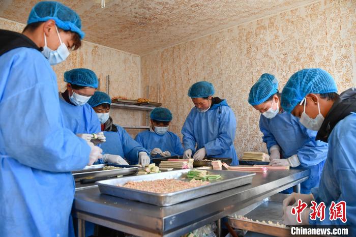 2月10日,西藏拉薩市林廓北路一家卡塞店里,工人在直播賣卡塞?!翱ㄈ笔且环N油炸面食,是藏歷新年必不可少的食物。隨著藏歷新年的日益臨近,古城拉薩各個加工銷售“卡塞”的店鋪飄出陣陣香味。中新社記者 貢嘎來松 攝