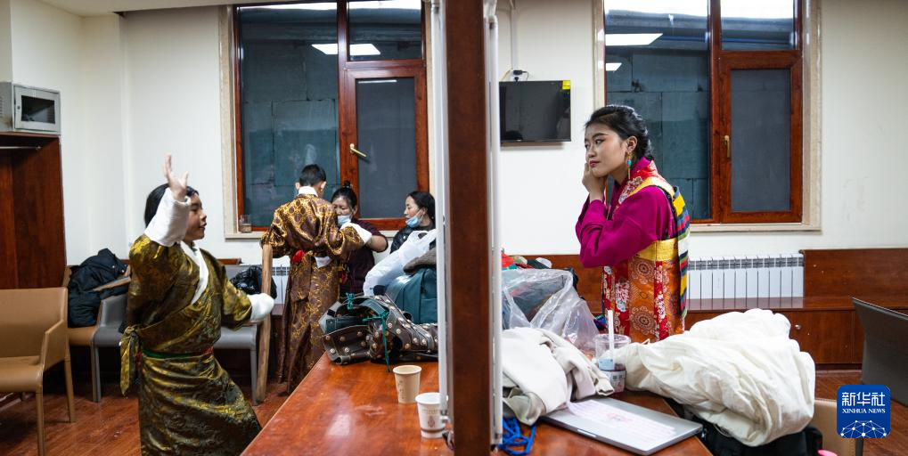 小演員在準(zhǔn)備演出舞臺劇藏戲《頓月頓珠》(2月11日攝)。新華社記者 丁增尼達 攝