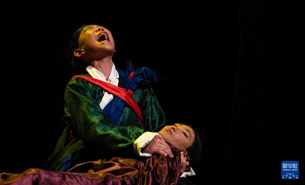 西藏首部少兒舞臺劇藏戲《頓月頓珠》演出現(xiàn)場;羅桑朗覺(右)飾演“頓月”,旦增夢朗(左)飾演“頓珠”(2月11日攝)。新華社記者 丁增尼達 攝