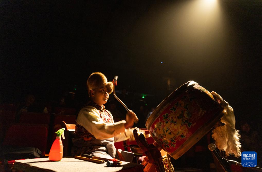 小演員敲鑼打鼓為藏戲表演伴奏(2月11日攝)。新華社記者 丁增尼達 攝