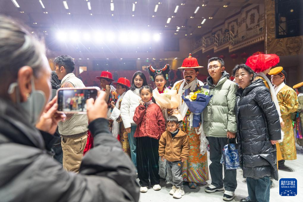 演出結(jié)束后小演員們與家人合影留念(2月11日攝)。新華社記者 丁增尼達 攝