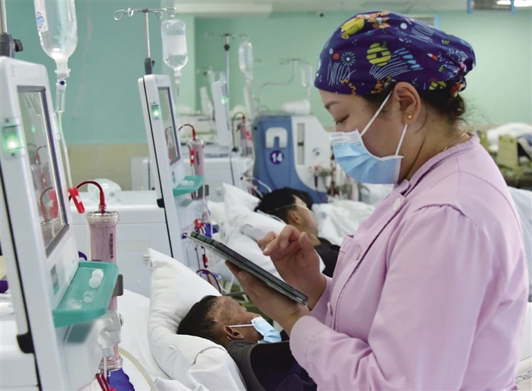 醫(yī)護人員身著整潔的白大褂,穿梭于透析機之間,細心調(diào)整透析參數(shù),檢查每一臺透析機,密切關(guān)注每位患者的身體狀況。對于患者來說,每周三次、每次長達4小時的透析治療,是維系生命的重要通道。