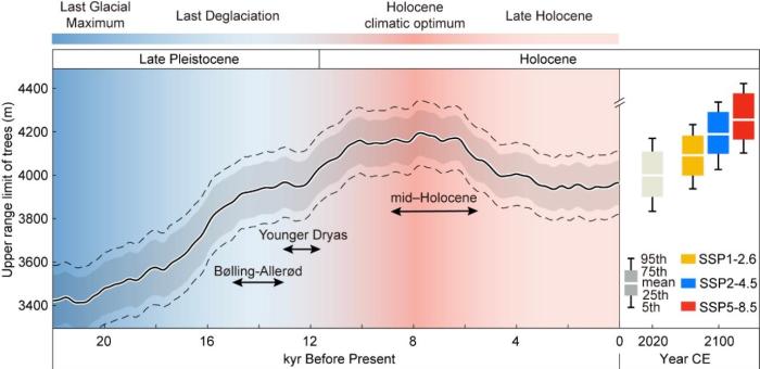 研究結(jié)果顯示,青藏高原平均樹線海拔在末次冰期最低(約3426米);全新世大暖期(距今約8000年)達(dá)到最高(約4187米),比當(dāng)前的平均樹線(約4009米)高約180米。冰期與間冰期樹線波動幅度高達(dá)850米,導(dǎo)致間冰期高山特有物種棲息地面積僅為冰盛期的約50%。