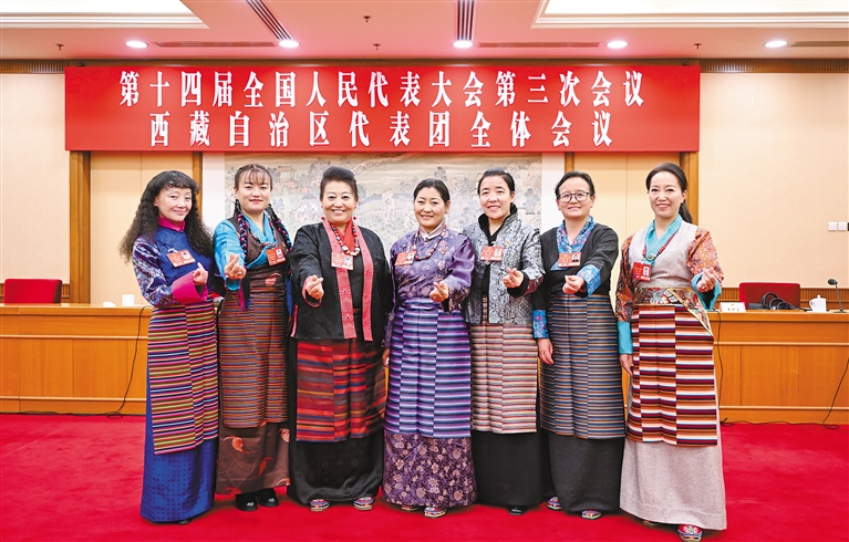 圖為西藏全國(guó)人大代表中的“七朵金花”在西藏代表團(tuán)主會(huì)場(chǎng)合影留念,并祝福全區(qū)婦女同胞“三八”國(guó)際勞動(dòng)?jì)D女節(jié)快樂(lè)。記者 旦增西旦 攝