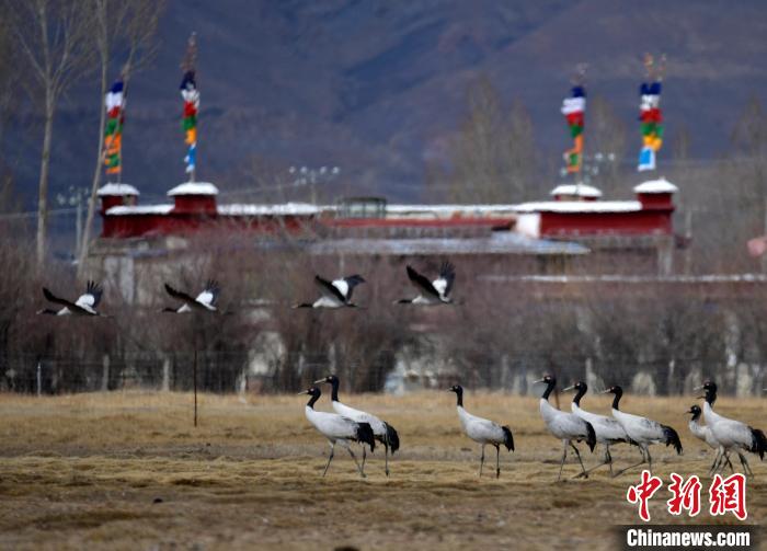 圖為3月8日,西藏拉薩林周縣黑頸鶴保護(hù)區(qū),黑頸鶴在田間覓食、嬉戲。中新社記者 李林 攝