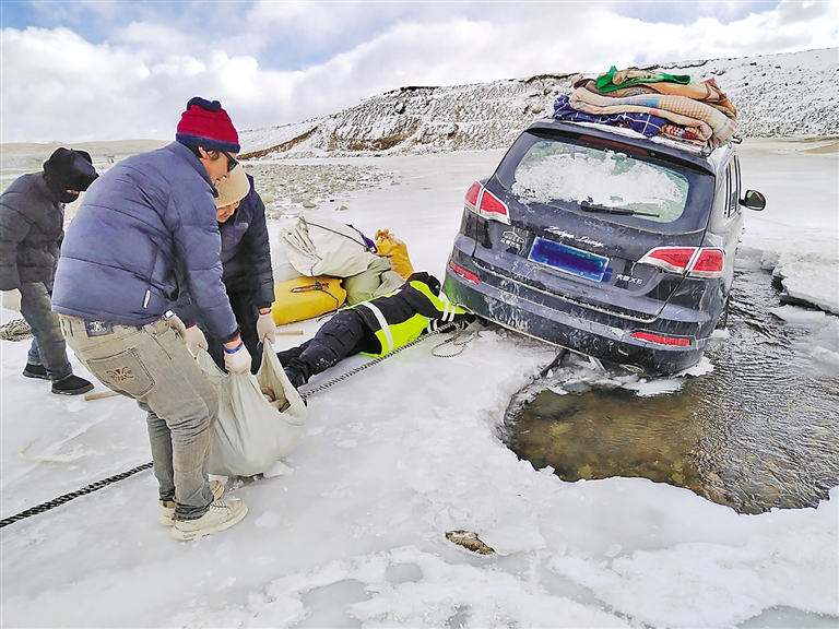2月16日,聶榮縣公安局桑榮鄉(xiāng)派出所接到轄區(qū)群眾報警求助,稱其在前往冬季牧場途中,車輛不慎陷入結(jié)冰河道,無法自行脫困。接警后,派出所立即組織警力攜帶救援工具第一時間趕到現(xiàn)場,只見,被困車輛右側(cè)輪胎陷入冰層,動彈不得。對此,民(輔)警迅速采取救援措施,冒著嚴(yán)寒使用鐵鍬鑿開并清理輪胎周圍冰層,俯臥在冰面上,為車輛綁上拖車?yán)K,采取車?yán)送频确绞?,全力幫助車輛脫困。最終,經(jīng)過五個多小時的不懈努力,成功將被困車輛拖拽至安全地帶。