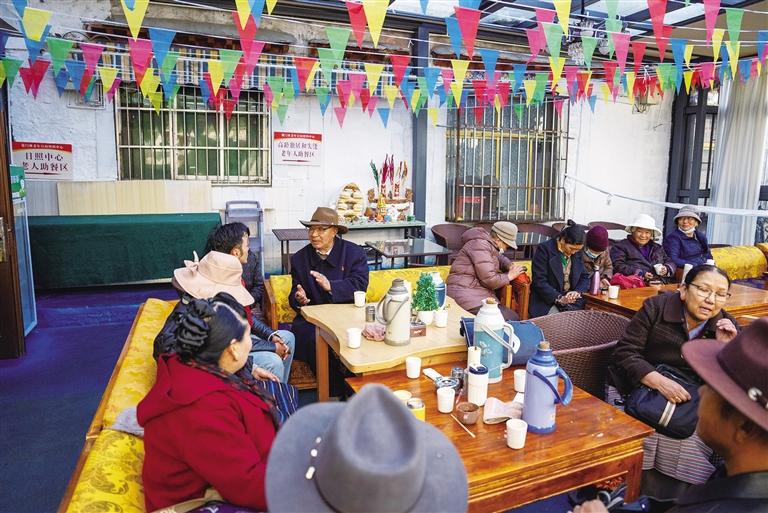 1956年出生的赤來(lái),是策門(mén)林老年日間照料中心的???,他和老伴居住在拉薩市城關(guān)區(qū)八朗學(xué)社區(qū),已在拉薩生活了30多年?;貞浧疬^(guò)去的歲月,赤來(lái)感慨萬(wàn)千:“聽(tīng)我爺爺奶奶說(shuō),以前的生活真的很苦,我們住在帳篷里,靠放牧為生,經(jīng)常挨餓受凍?,F(xiàn)在黨和政府的政策好,我們的生活發(fā)生了翻天覆地的變化?!闭勂鹑缃竦纳钭兓鄟?lái)認(rèn)為最直觀、最明顯的就是住房條件的改善,“我的老家在那曲,那里海拔高、氣候寒冷,到了冬天,寒風(fēng)會(huì)灌進(jìn)帳篷,大家凍得直打哆嗦。那時(shí)候,能有個(gè)不漏風(fēng)的帳篷住就不錯(cuò)了,哪里敢奢望現(xiàn)在這樣的生活。”