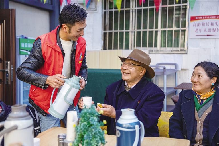 “波啦,您來(lái)啦,快坐下來(lái)喝點(diǎn)熱茶?!薄澳玻龝?huì)午飯?jiān)谶@邊吃嗎?”近日,記者來(lái)到拉薩市城關(guān)區(qū)蕃陽(yáng)社會(huì)工作者和志愿者服務(wù)協(xié)會(huì)下的策門(mén)林老年日間照料中心,剛進(jìn)大門(mén)就被一群正在鍛煉身體的老人所吸引。他們跟著老師抬手、踢腿、扭腰,動(dòng)作整齊劃一,臉上洋溢著幸福的笑容。鍛煉結(jié)束后,赤來(lái)回到助餐區(qū),邊喝甜茶邊吃“卡賽”,和老人們分享趣聞,拉著家常,現(xiàn)場(chǎng)傳來(lái)一陣陣歡聲笑語(yǔ)。