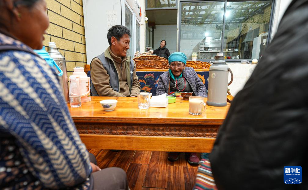 玉珍奶奶在自家的茶館里和孫子及鄰居喝茶聊天(3月12日攝)。新華社記者 晉美多吉 攝