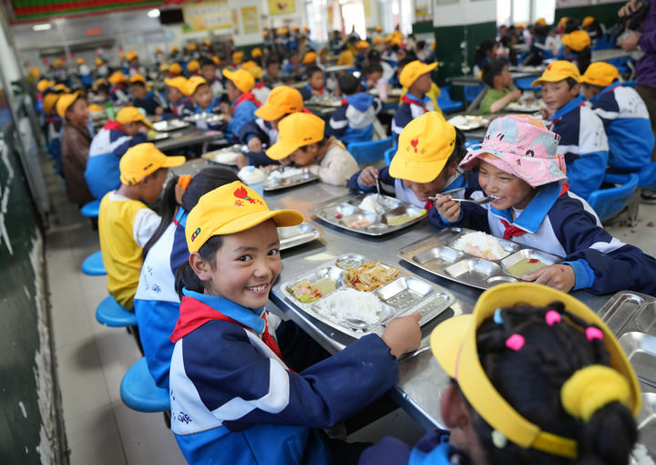西藏林芝市工布江達(dá)縣娘蒲鄉(xiāng)中心小學(xué)學(xué)生在食堂用餐(2024年9月3日攝)。新華社記者 晉美多吉 攝