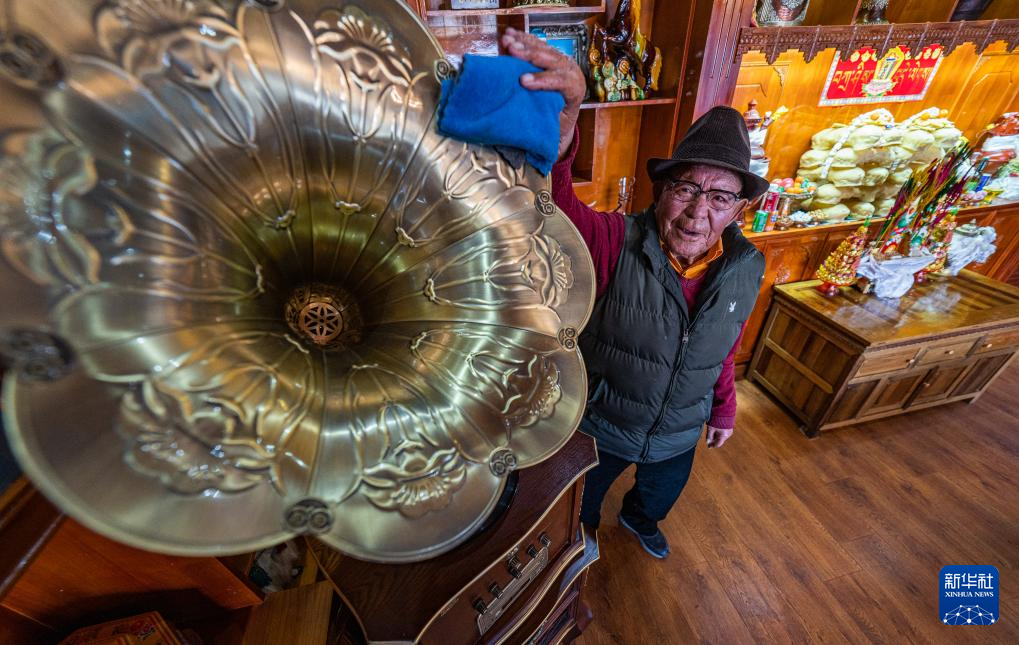 洛桑老人在家中擦拭留聲機(jī)(3月20日攝)?!⌒氯A社記者 丁增尼達(dá) 攝